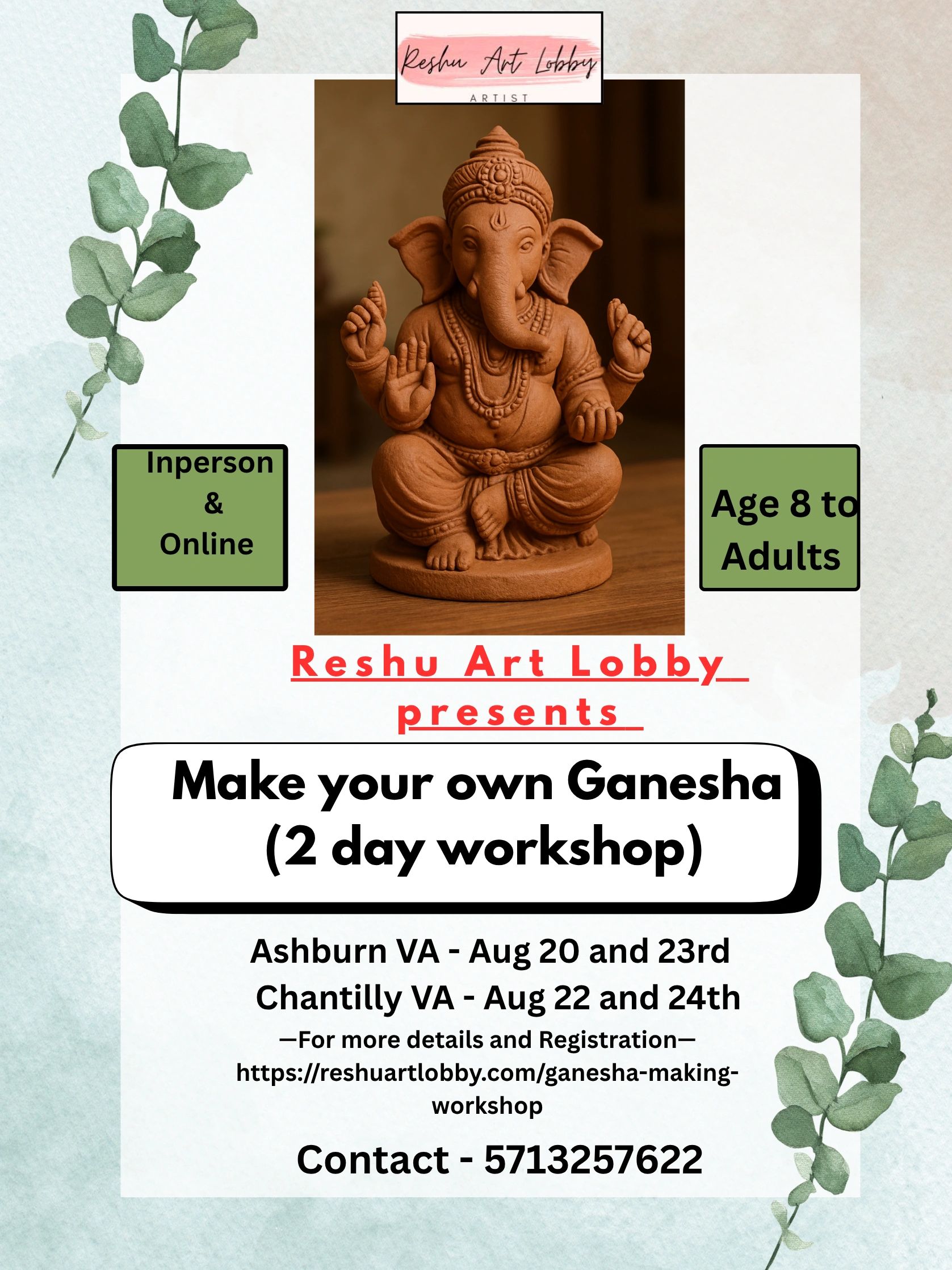 This workshop is the highlight of our year—and our clients agree! Many look forward to it all year long. The price includes all art supplies, hands-on clay sculpting to create a Ganesha idol, as well as painting and decorating it.